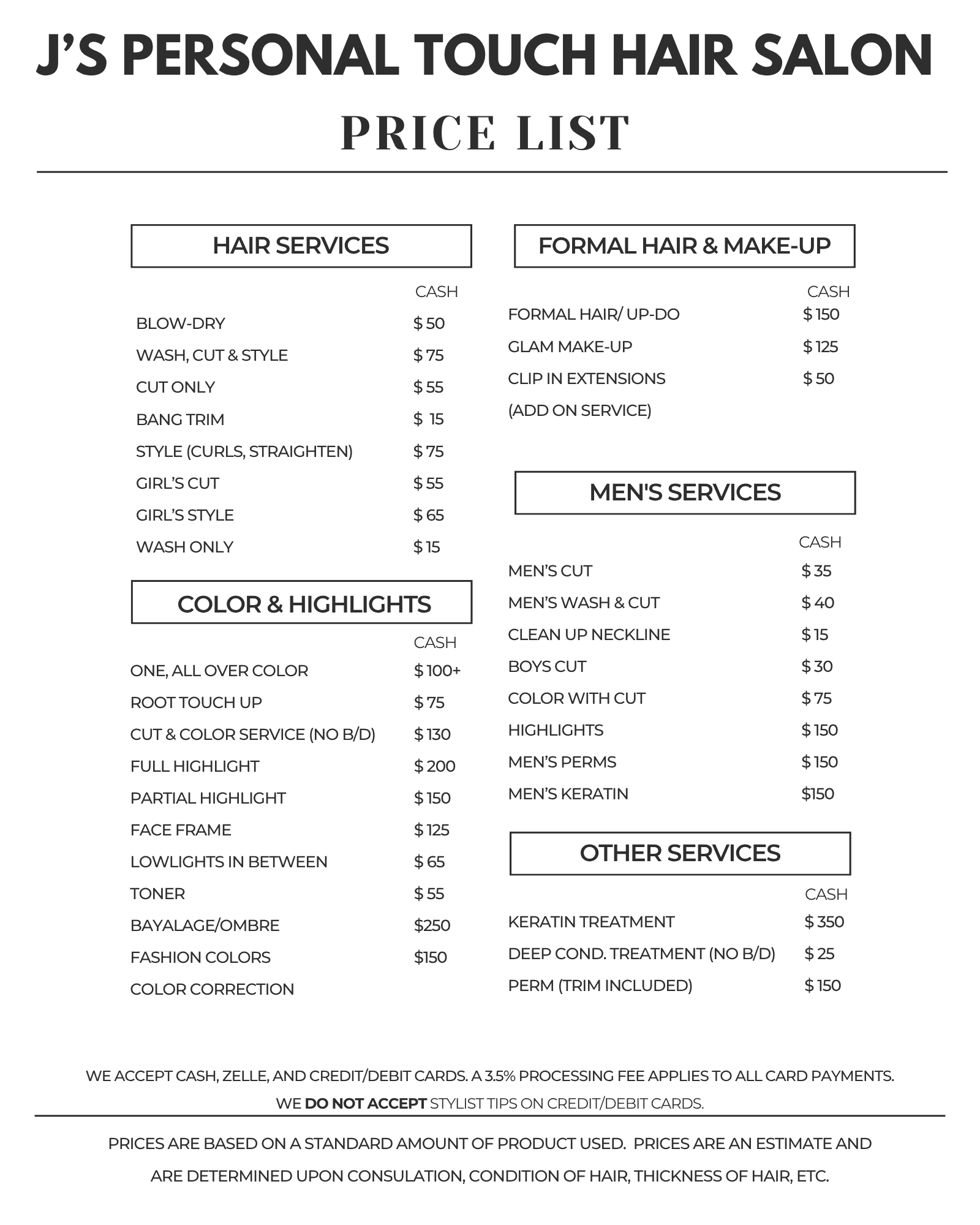 We accept cash, Zelle, and credit/debit cards. A 3.5% processing fee applies to all card payments.